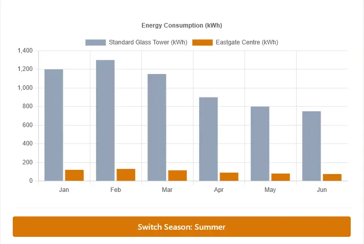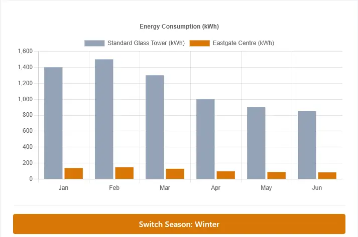 The graphs below compare the energy consumption of a standard glass tower versus the Eastgate Centre across different seasons.